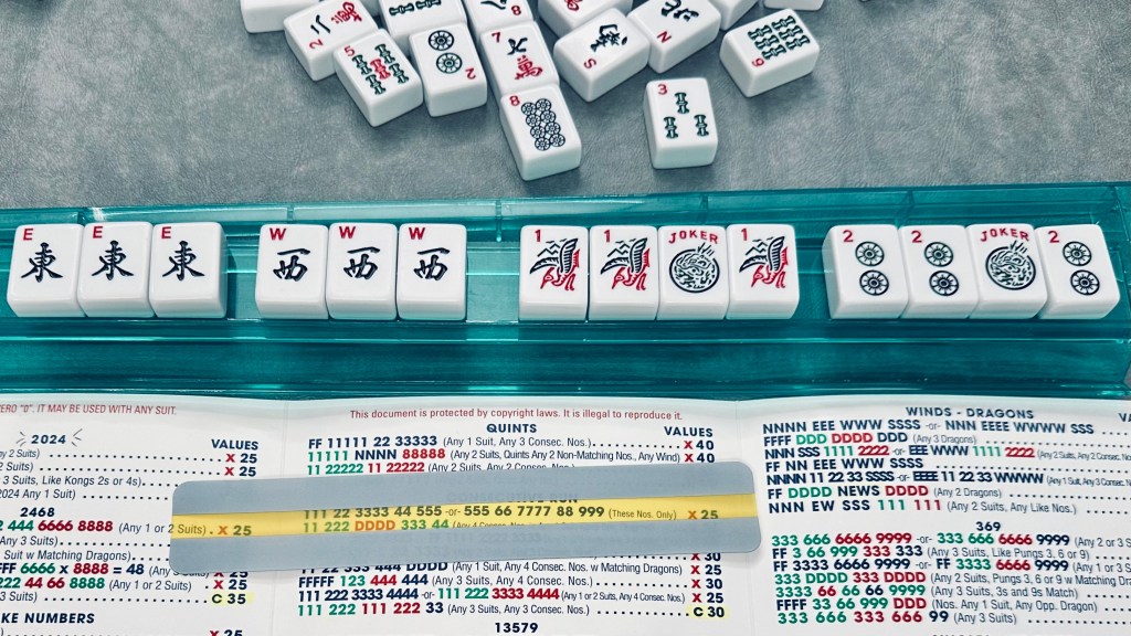 Each year, on April 1st, the League releases the latest folding card outlining its revised rules of play as well as the permissible Mahjong hands for the coming year, the combination of 14 tiles — Jokers alongside Dragons and Winds and Flowers and numbers drawn from three different suits (called Bam, Crak, and Dot) — that will allow individual players to win a game. Like the women I play with, I am a card-carrying member of the League (I have an NMJL membership number to prove it) — and like them, I am very eagerly anticipating the arrival of my new 2025 card in the mail.